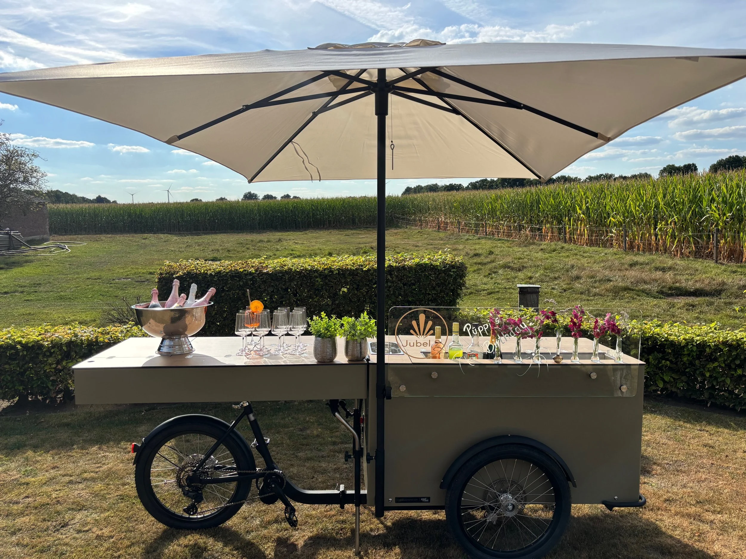 Unser Bike ist ein Elektro-Lastenfahrrad mit integrierter Kühlung. So kommen die Getränke gekühlt bei Euch an.